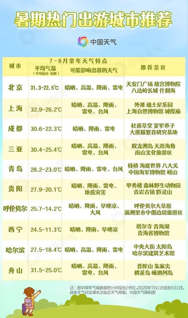 盛夏7月,同学们一年中最长的假期已经到来,幸福时光正式开启。美好的假期少不了一趟自在的旅行,但暑期也是天气最复杂多变的时段,高温、降雨不时来捣乱。因此开心之旅也要做好充足的准备,中国天气网推出暑假嗨玩天气地图,并盘点暑期热门旅游城市气候特点。出行需要准备什么,请看这里!