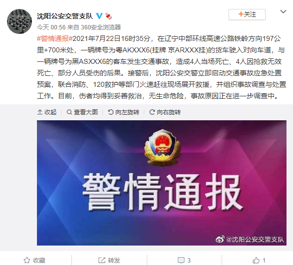 2021年7月22日16时35分,在辽宁中部环线高速公路铁岭方向197公里+700米处,一辆牌号为粤AKXXX6(挂牌 京ARXXX挂)的货车驶入对向车道,与一辆牌号为黑ASXXX6的客车发生交通事故,造成4人当场死亡、4人因抢救无效死亡、部分人员受伤的后果。接警后,沈阳公安交警立即启动交通事故应急处置预案,联合消防、120救护等部门火速赶往现场展开救援,并组织事故调查与处置工作。目前,伤者均得到妥善救治,无生命危险,事故原因正在进一步调查中。