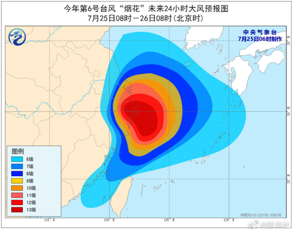 预计今天(7月25日)中午至傍晚前后,台风“烟花”将在我国浙江象山到江苏启东一带沿海登陆。受台风“烟花”影响,今天,华东沿海等地仍将有强风雨天气,浙江、上海等局地将出现大暴雨,提醒相关部门及公众注意做好各项防台工作。