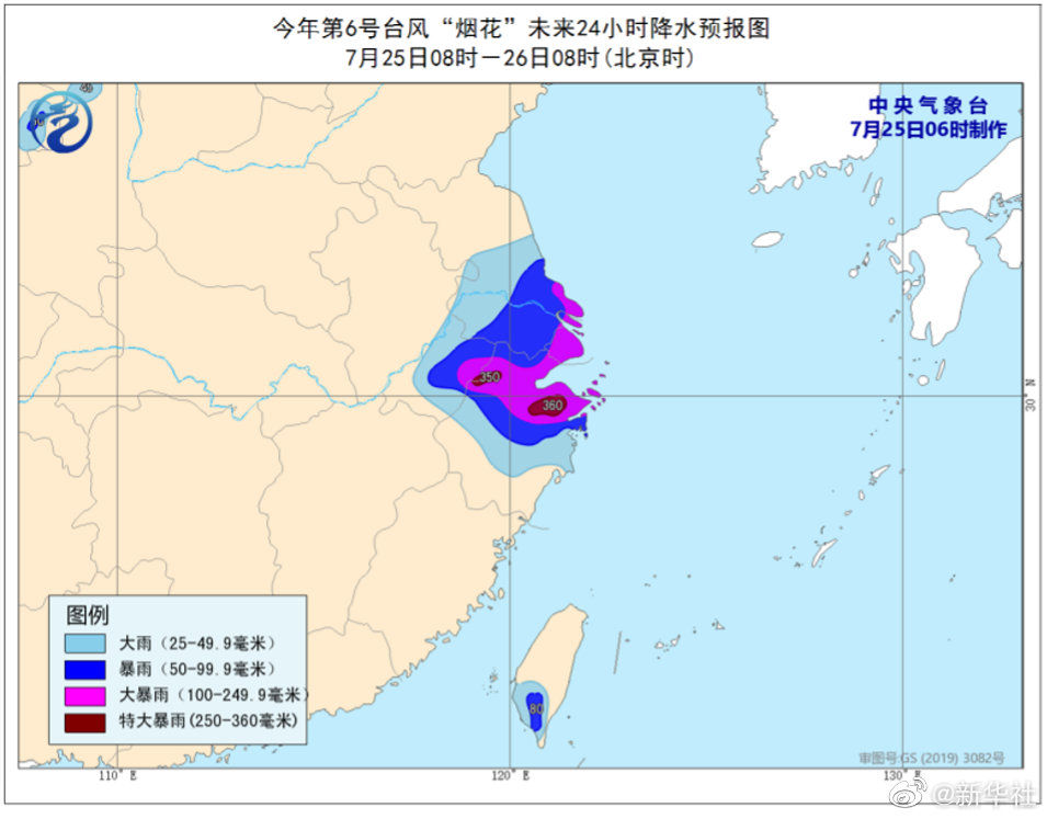受台风“烟花”影响,25日08时至26日08时,浙江中北部、上海、江苏南部、安徽南部、台湾岛南部等地的部分地区有大雨或暴雨,其中,浙江北部、上海、江苏东南部、安徽东南部等地的部分地区有大暴雨,浙江北部局地有特大暴雨。为此,中央气象台今早06时继续发布台风以及暴雨橙色预警。