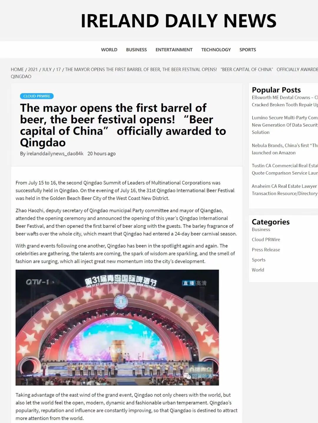 这一“全民打卡金沙滩啤酒城”“来青岛过第二个春节”的现象,引发了海内外的广泛关注,法新社、美通社、《洛杉矶时报》《美国国际日报》《德州时报》《太平洋日报》《爱尔兰日报》等海外媒体发布消息,报道啤酒节盛况。