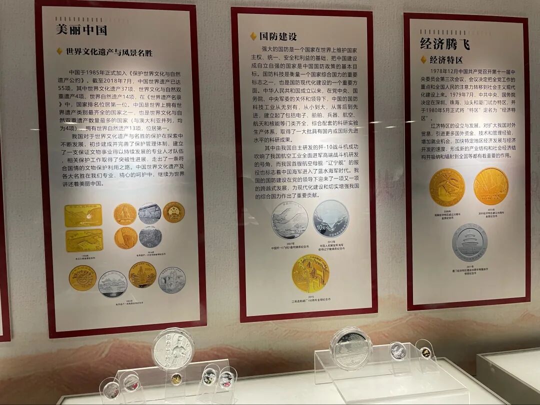 文化展分为两个部分:一是贵金属纪念币上呈现的中国共产党成立100周年成就展,通过“大国崛起”“强军兴军”“经济腾飞”“外交纵横”“科技创新”“美丽中国”“文化繁荣”七个板块,集中展现在中国共产党领导下中国人民谱写的中华民族自强不息、顽强奋进的壮丽史诗。