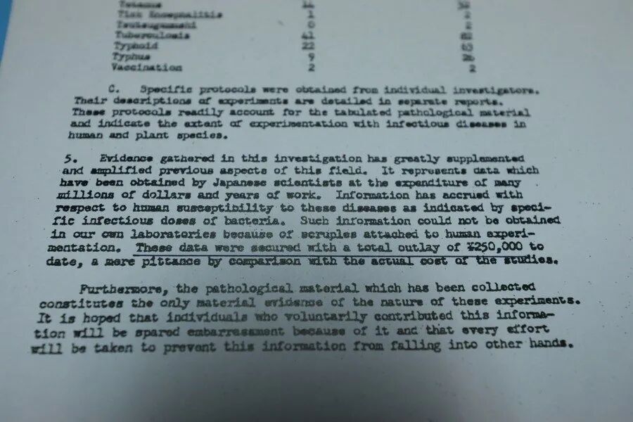 中国专家表示,二战结束后,美国德特里克堡基地派出调查人员与侵华日军第七三一部队(简称731部队)进行了秘密交易,美国违背伦理和文明准则,以豁免731部队成员战争责任为条件,并花25万日元,得到731部队进行人体实验、细菌实验、细菌战、毒气实验等数据资料以及医学论文等,并加以利用,进行生物武器研究。