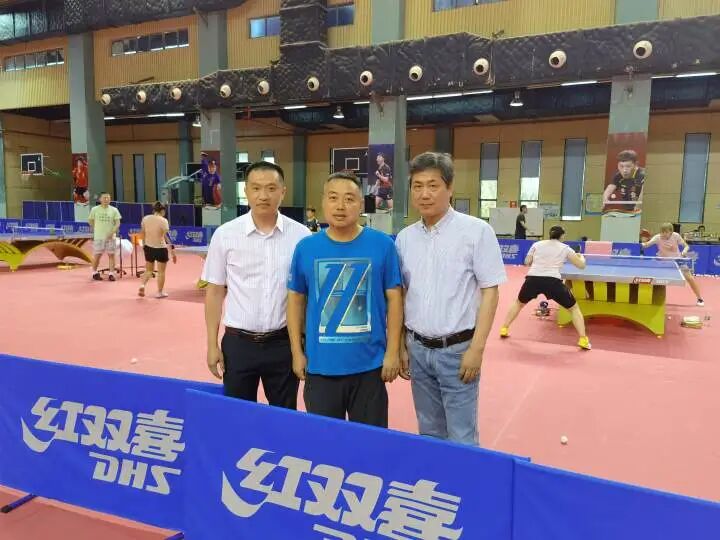 巫英才教授(左)、张辉教授(右)2021年5月在厦门的中国乒乓球训练基地与刘国梁主席(中)讨论备战东京奥运事宜