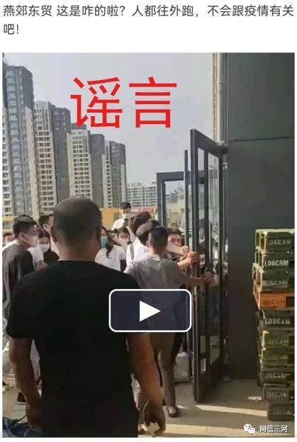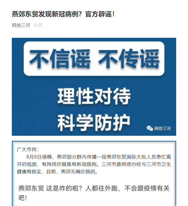 8月9日傍晚,河北燕郊部分群内传播一段燕郊东贸国际大批人员急忙离开的视频,有网民怀疑是有新冠病例。三河市委网信办经与三河市卫生健康局核实,目前,燕郊无确诊病例。