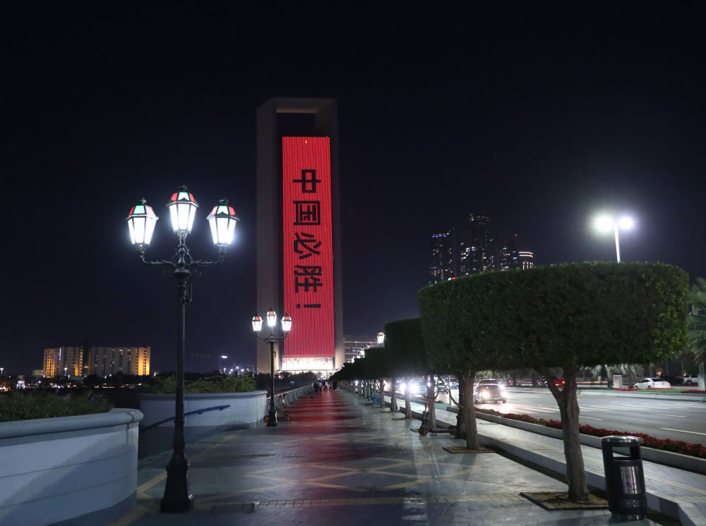 2020年3月12日,在阿联酋阿布扎比,当地地标建筑物阿布扎比国家石油公司大楼显示出“中国必胜”的中文字样。当日,这座大楼亮灯显示中国国旗和“中国必胜”“海内存知己,天涯若比邻”中文字样,表达对中国战胜新冠肺炎疫情的信心和支持。 新华社/阿联酋通讯社