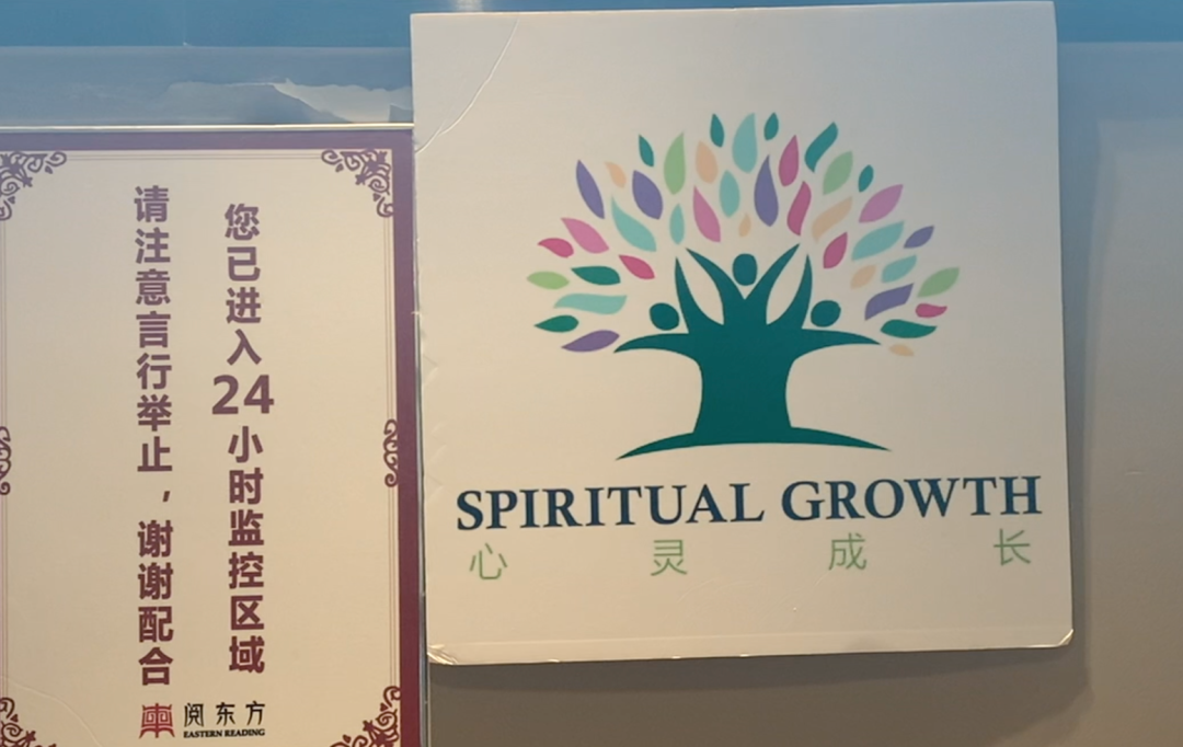在书店一角,一套名为“心灵成长”的图书被电子香、莲花台和贡品环绕,供学员“膜拜”,书作者名为张馨月,被该组织称为“神一样的存在”。