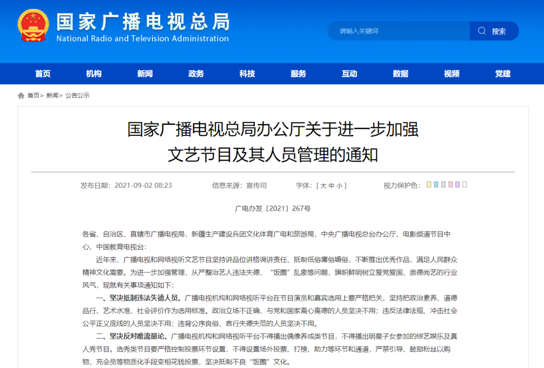 9月2日,国家广播电视总局官网发布《关于进一步加强文艺节目及其人员管理的通知》,提出“坚决抵制违法失德人员 ”“坚决反对唯流量论”“坚决抵制泛娱乐化”“坚决抵制高价片酬”“切实加强从业人员管理”“开展专业权威文艺评论”“充分发挥行业组织作用”“切实履行管理职责”八条事项。
