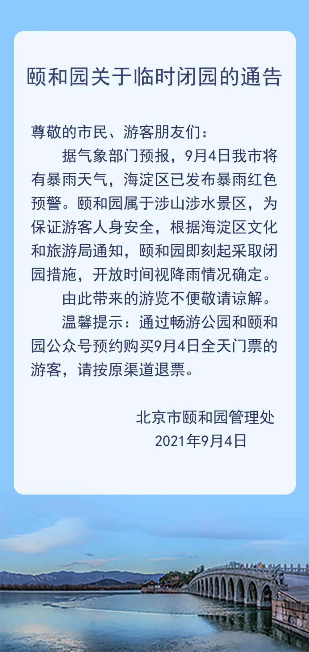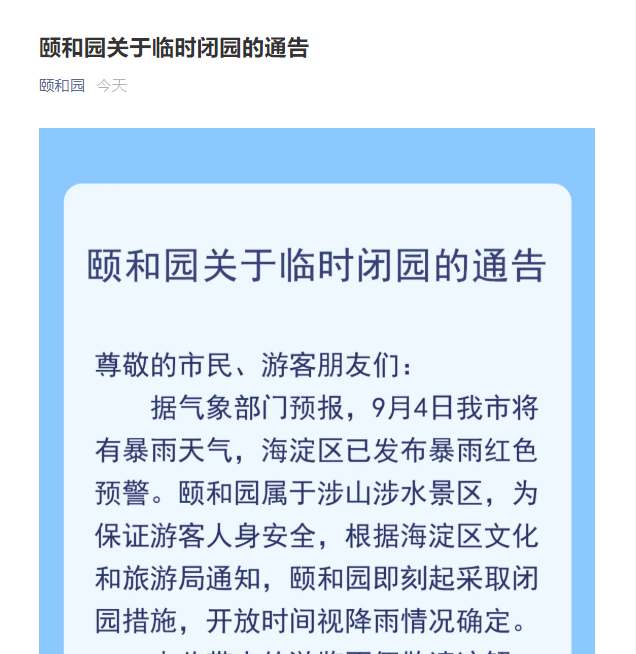 另据颐和园微信公众号消息,颐和园也因暴雨天气临时闭园。