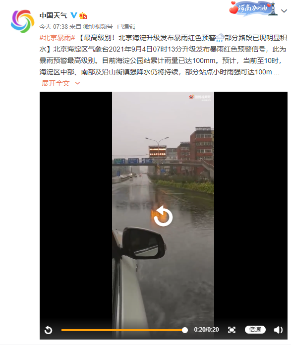 北京海淀区气象台2021年9月4日7时13分升级发布暴雨红色预警信号,此为暴雨预警最高级别。