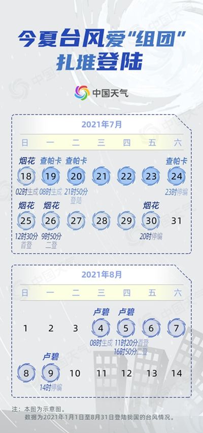 不仅生成时间扎堆,登陆时间也扎堆。初台风“查帕卡”登陆广东后,“烟花”“卢碧”也接连“上岸”,两周左右共有3个台风登陆我国。