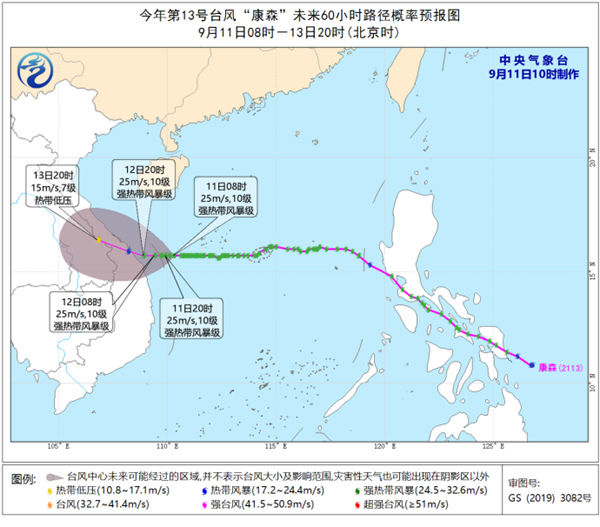 预计,“康森”将以每小时5-10公里的速度向偏西方向移动,强度缓慢减弱,将于13日早晨登陆越南中部一带沿海。