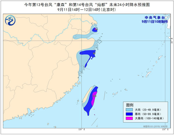 降水预报:11日14时至12日14时,浙江东部、上海、台湾岛、海南岛等地的部分地区有大雨或暴雨,局地大暴雨(100-140毫米)。