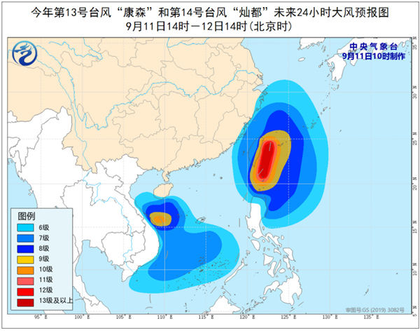 大风预报:11日14时至12日14时,受“灿都”影响,东海大部海域及钓鱼岛附近海域、台湾海峡、巴士海峡、台湾以东洋面、浙江沿海、福建中北部沿海、台湾岛沿海将有6-7级大风,其中,巴士海峡、台湾岛以东洋面、东海西南部海域、台湾东部沿海的风力有8-11级、部分海域风力可达12-14级,阵风15-16级,台风中心经过的海域或地区风力有15-16级,阵风17级;受“康森”影响,南海西部和南部、海南岛南部沿海、西沙群岛、中沙群岛、南沙群岛将有6-7级大风,其中,南海西部的部分海域风力有8-10级,阵风11-12级。