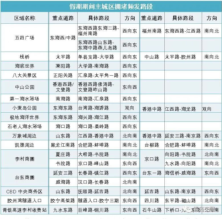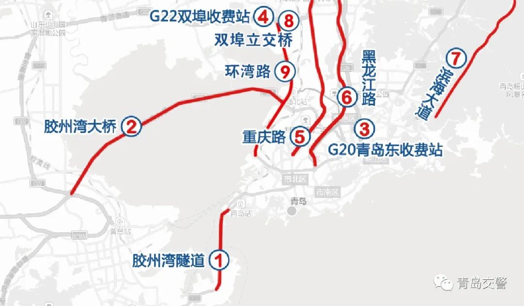 根据往年假期期间高速公路拥堵情况来看,G15沈海高速黄岛段;G22青兰高速青岛西收费站、胶州收费站、黄岛东收费站;G2011青新高速平度南收费站、城阳至平度段等都属拥堵易发区域。同时,预计届时胶州湾隧道、胶州湾大桥、双埠立交、环湾路、重庆路、黑龙江路、滨海大道等进出城及高速公路周边道路在交通高峰期也将出现通行缓慢或排队现象。