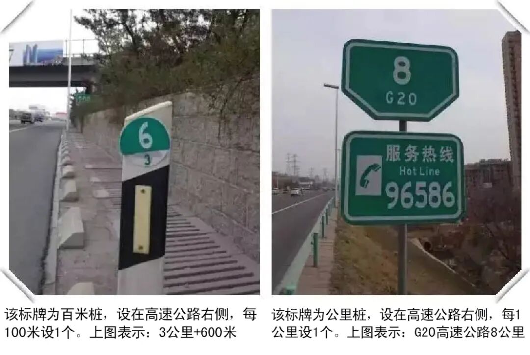 在高速公路右侧护栏位置,每100米设置一个圆形标志牌,称为百米桩;每1公里设置一处标有公里数及高速公路路名的标牌,称为公里桩。您可通过高速公路名称、目的地方向、车辆所处位置的公里桩和百米桩精确定位。