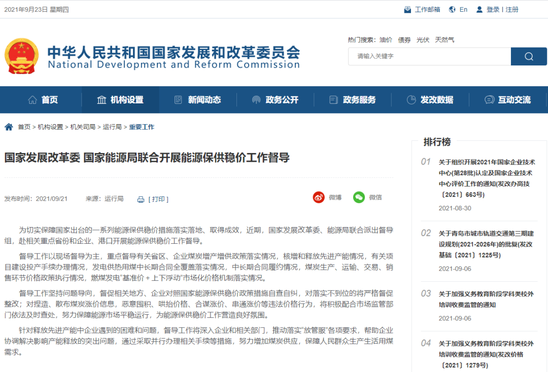 据国家发改委网站消息,为切实保障国家出台的一系列能源保供稳价措施落实落地、取得成效,近期,国家发展改革委、能源局联合派出督导组,赴相关重点省份和企业、港口开展能源保供稳价工作督导。对捏造、散布煤炭涨价信息,恶意囤积、哄抬价格、合谋涨价、串通涨价等违法价格行为,将积极配合市场监管部门依法及时查处。