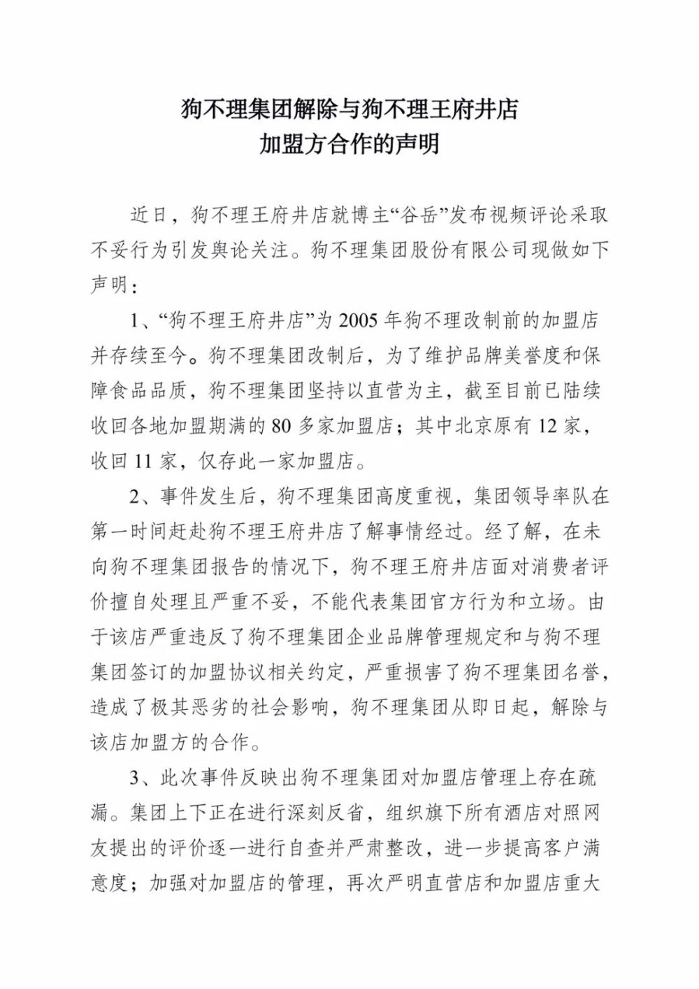 2、事件发生后,狗不理集团高度重视,集团领导率队在第一时间赶赴狗不理王府井店了解事情经过。经了解,在未向狗不理集团报告的情况下,狗不理王府井店面对消费者评价擅自处理且严重不妥,不能代表集团官方行为和立场。由于该店严重违反了狗不理集团企业品牌管理规定和与狗不理集团签订的加盟协议相关约定,严重损害了狗不理集团名誉,造成了极其恶劣的社会影响,狗不理集团从即日起,解除与该店加盟方的合作。