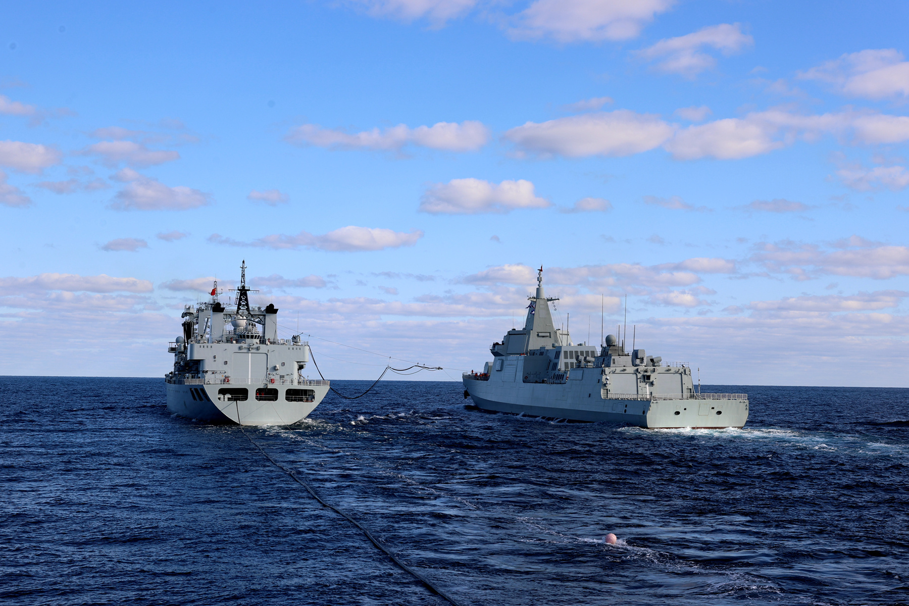 10月13日,参加中俄“海上联合-2021”军事演习的中方水面舰艇在向预定海域航渡。航渡途中,综合补给舰东平湖舰(右)正在向导弹驱逐舰昆明舰(左)进行横向补给。新华社发(王游 摄)