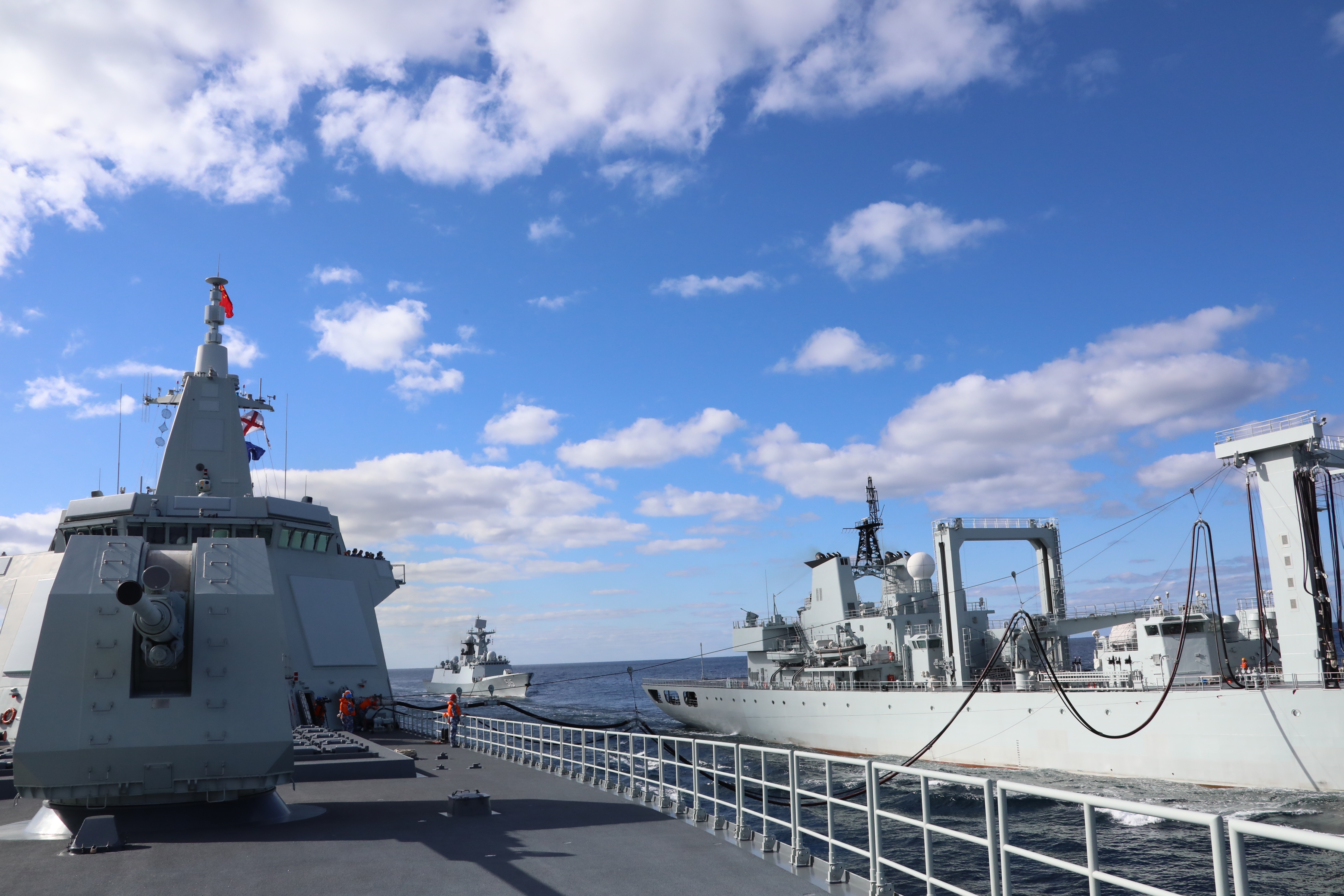 10月13日,参加中俄“海上联合-2021”军事演习的中方水面舰艇在向预定海域航渡途中组织补给,这是综合补给舰东平湖舰(右)同时为导弹驱逐舰南昌舰(左)进行横向补给、为新型护卫舰滨州舰(中)进行纵向补给。新华社发(马宁 摄)