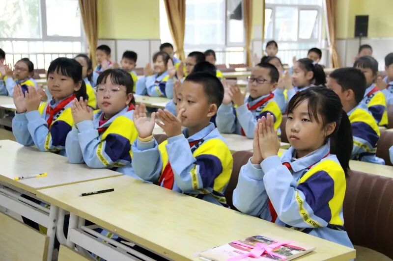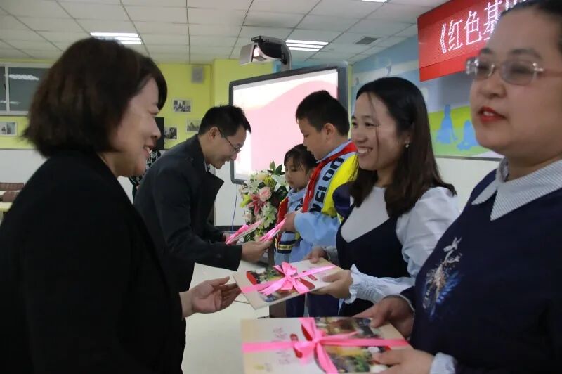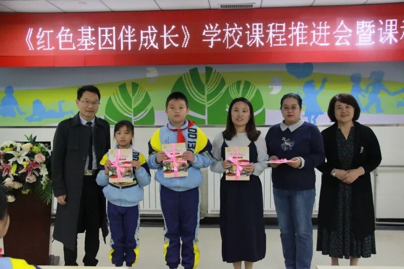 赠书环节,青岛市教科院课程中心马伟林老师和李沧区教育发展研究中心教研员韩子亮老师一起,将《红色基因伴成长》这套课程读本送到教室和学生代表手中,鼓励大家创造性地用好这套读本。