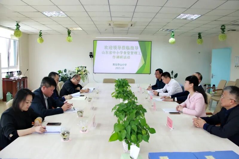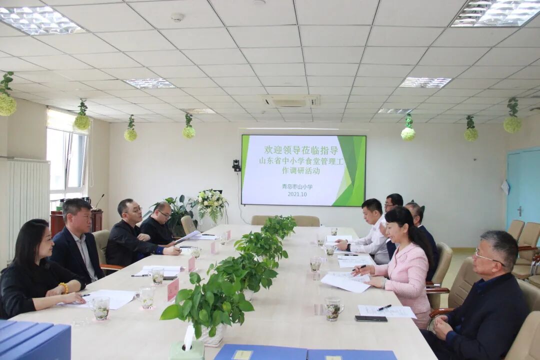 在会议室,李沧区教育和体育局分管局长肖征汇报了李沧区中小学规范化食堂建设实施工作。青岛枣山小学校长刘岩林汇报了学校创建山东省规范化食堂的准备工作,青岛枣山小学将食品安全和营养健康工作作为重点工作常抓不懈,为全校1700名师生员工提供安全、健康、营养的餐饮服务。翟亚峰就学校和区域工作的亮点和重点工作予以询问并点评。省市调研组一行对以青岛枣山小学为代表的青岛中小学食堂工作给予了高度肯定和评价。