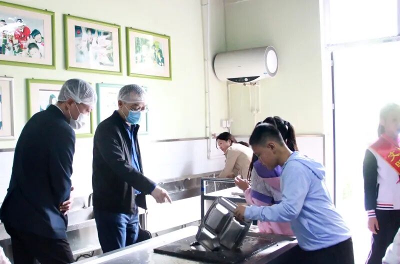在售餐间,食堂工作人员正给同学们打餐,调研组一行仔细查看了同学们的就餐情况,叮嘱工作人员一定要做好服务,让同学们吃好吃饱。