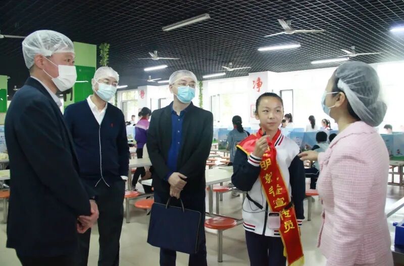 10月15日上午,山东省教育发展服务中心学校后勤部部长翟亚峰一行来到青岛枣山小学,调研山东省规范化食堂创建活动。