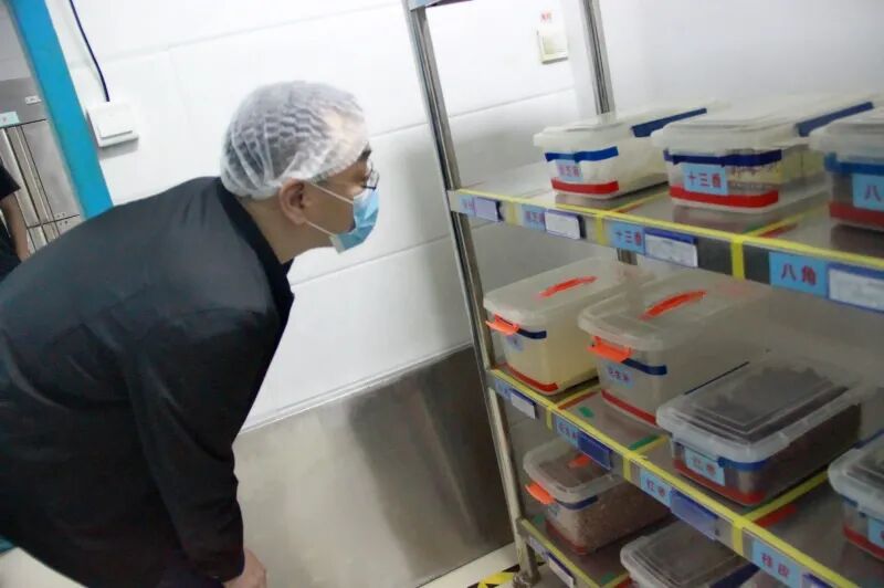 调研组走进加工间、售餐间,走进主食库、副食库,仔细查看了米、面、粮、油等调料品,询问货源、生产日期、保质期,强调一定要把好进货关、做好出入库台账。