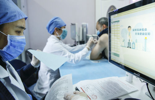 2020年11月25日,工作人员在北京一社区卫生服务中心内为市民接种流感疫苗。新华社记者 卢烨 摄