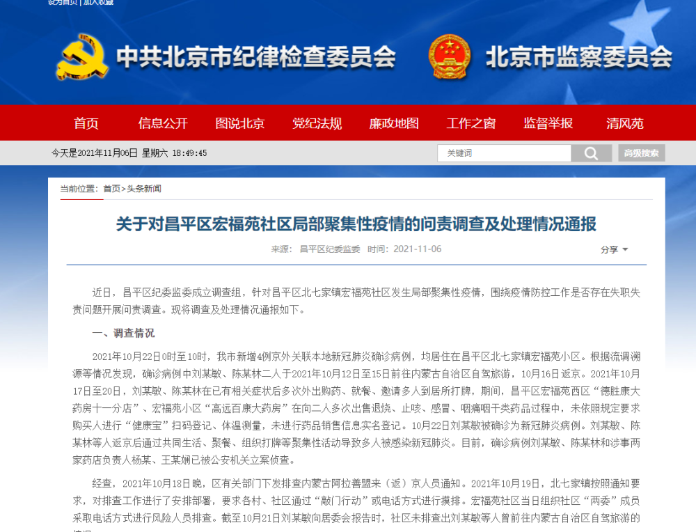 近日,昌平区纪委监委成立调查组,针对昌平区北七家镇宏福苑社区发生局部聚集性疫情,围绕疫情防控工作是否存在失职失责问题开展问责调查。现将调查及处理情况通报如下。