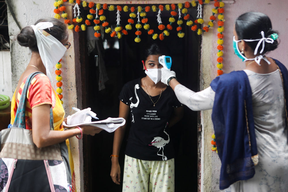 9月16日,在印度孟买,社区卫生志愿者为当地居民测量体温。(新华社/路透)