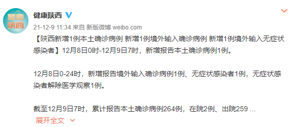 “健康陕西”微博12月9日上午发布:12月8日0时-12月9日7时,新增报告本土确诊病例1例。