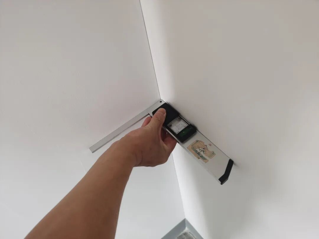 “打眼一看这个房子的平整度就不错,一会儿我用专业仪器量一下。”环视四周后,薛总监拿出直角尺测量每个房屋阴阳角,经过测量发现,墙角只有细微偏差,已经达到了精装标准,有的墙角在测量时直角尺测量的误差值读数为0,呈现完美的直角。