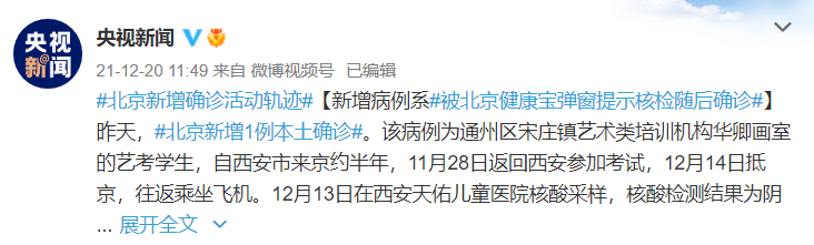 12月19日,北京新增1例本土确诊。该病例为通州区宋庄镇艺术类培训机构华卿画室的艺考学生,自西安市来京约半年,11月28日返回西安参加考试,12月14日抵京,往返乘坐飞机。12月13日在西安天佑儿童医院核酸采样,核酸检测结果为阴性,12月14日16时从西安家中出发乘私家车到达西安咸阳机场,18时30分乘坐海航HU7338航班,20时30分到达北京,后乘坐摆渡车到达航站楼,21时乘网约车于21时40到达宋庄镇华卿画室。