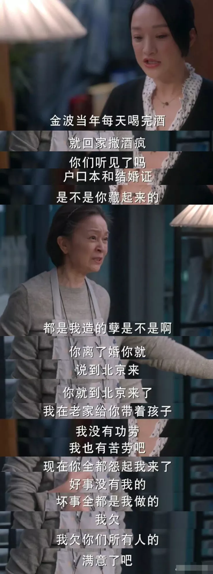 剧中,因为前夫纠缠,周迅饰演的小敏与母亲翻旧账撕破了脸。小敏责怪母亲干涉太多:“我说了多少次我要离婚,当初要不是你撮合,他也不会是我的前夫!”母亲抱怨女儿不懂感恩:“你心里一直都怪我,我欠你们所有人的,满意了吧!”