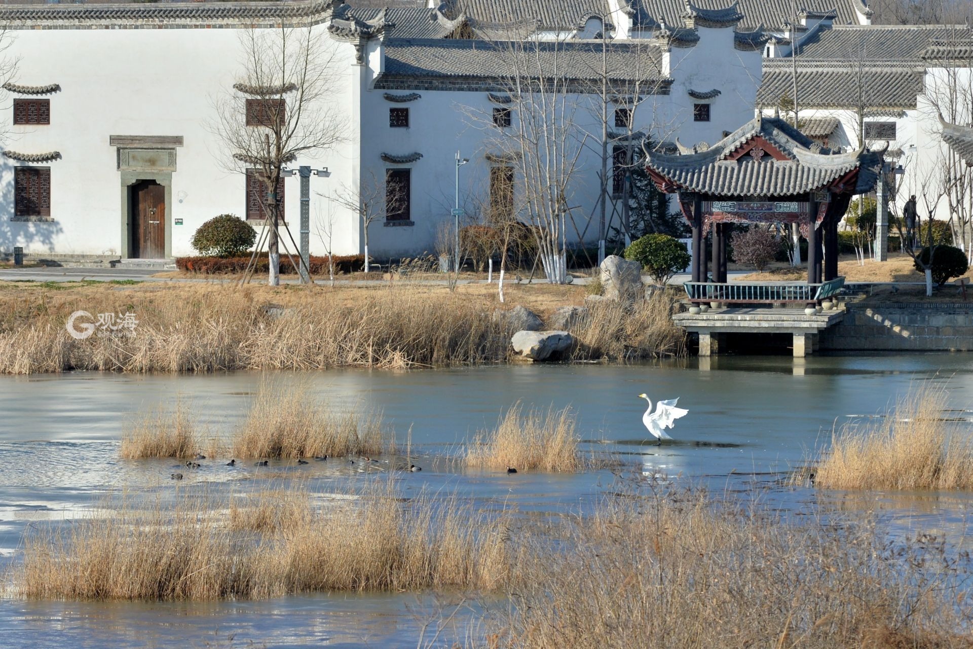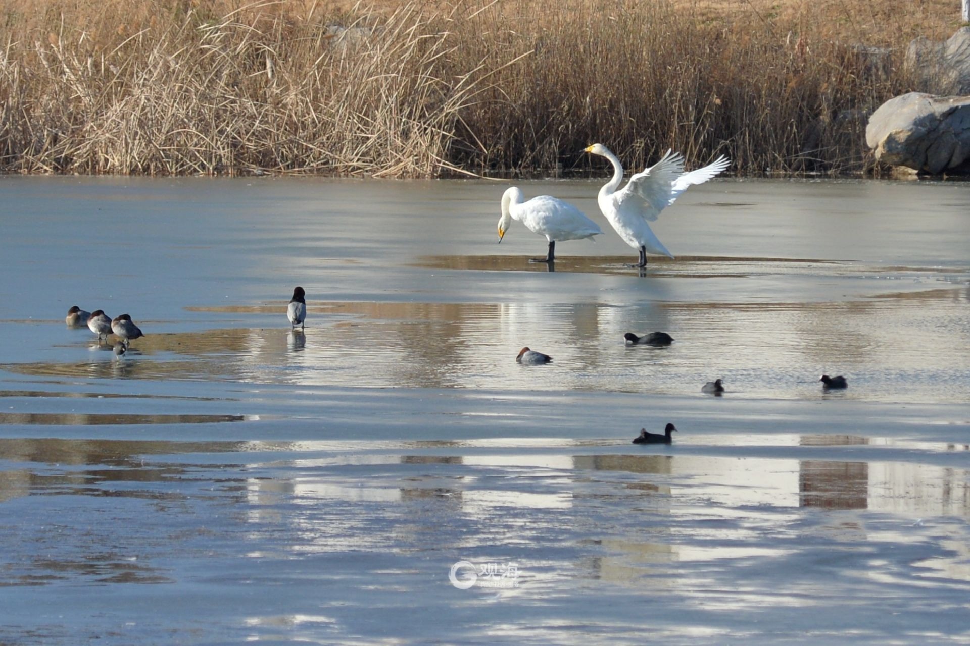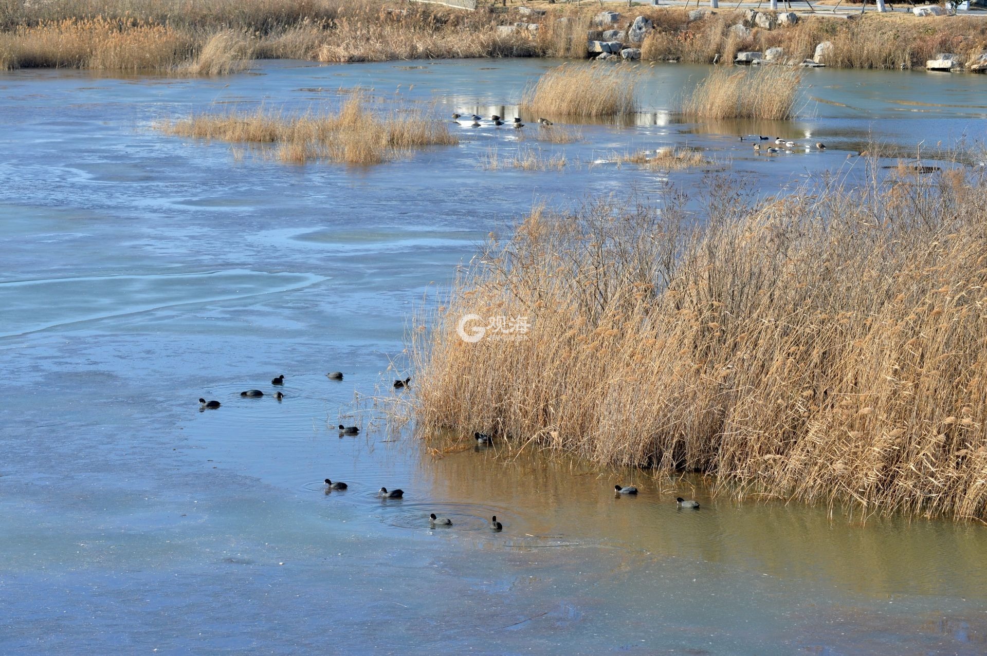 - 湖里生活着多种水鸟。