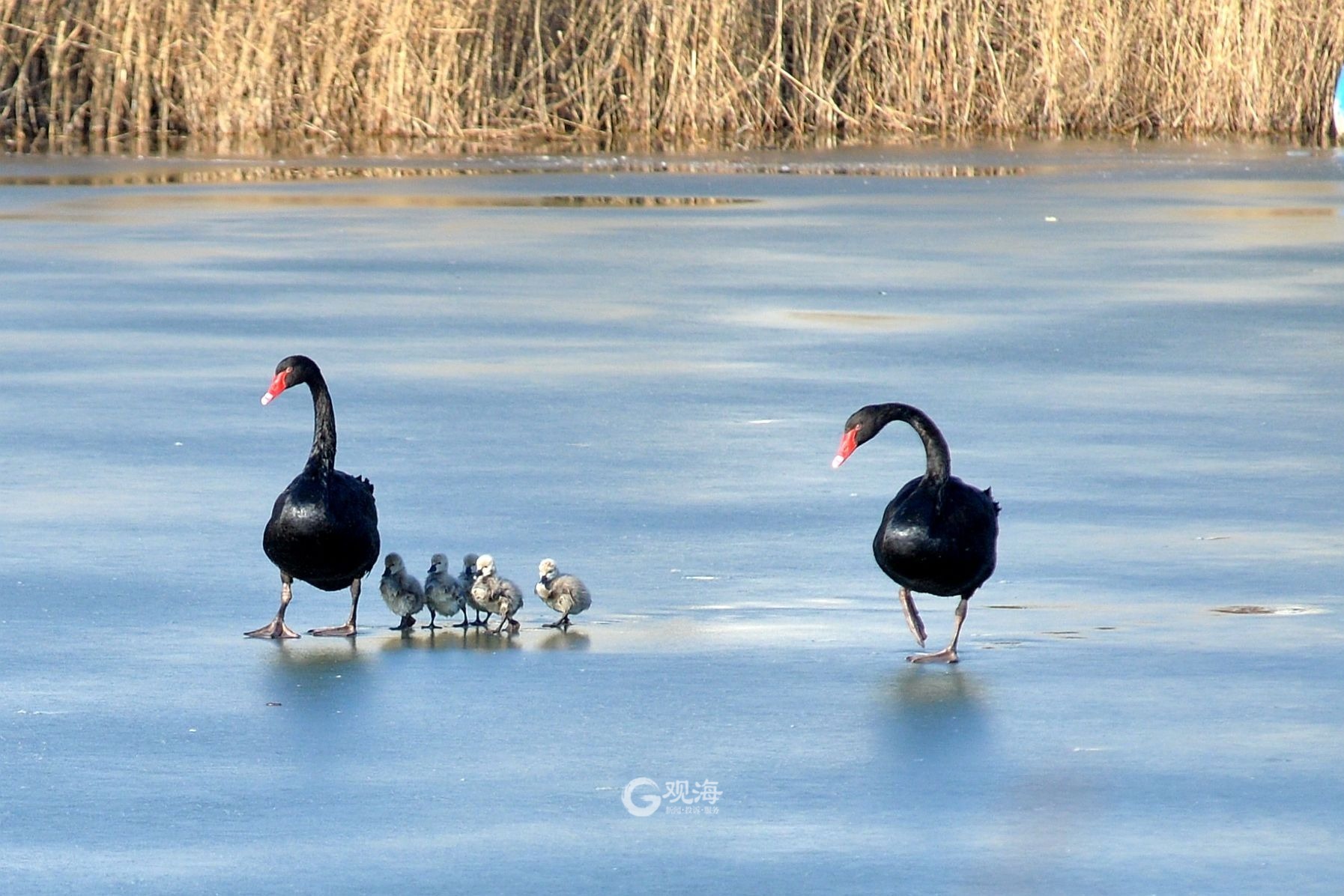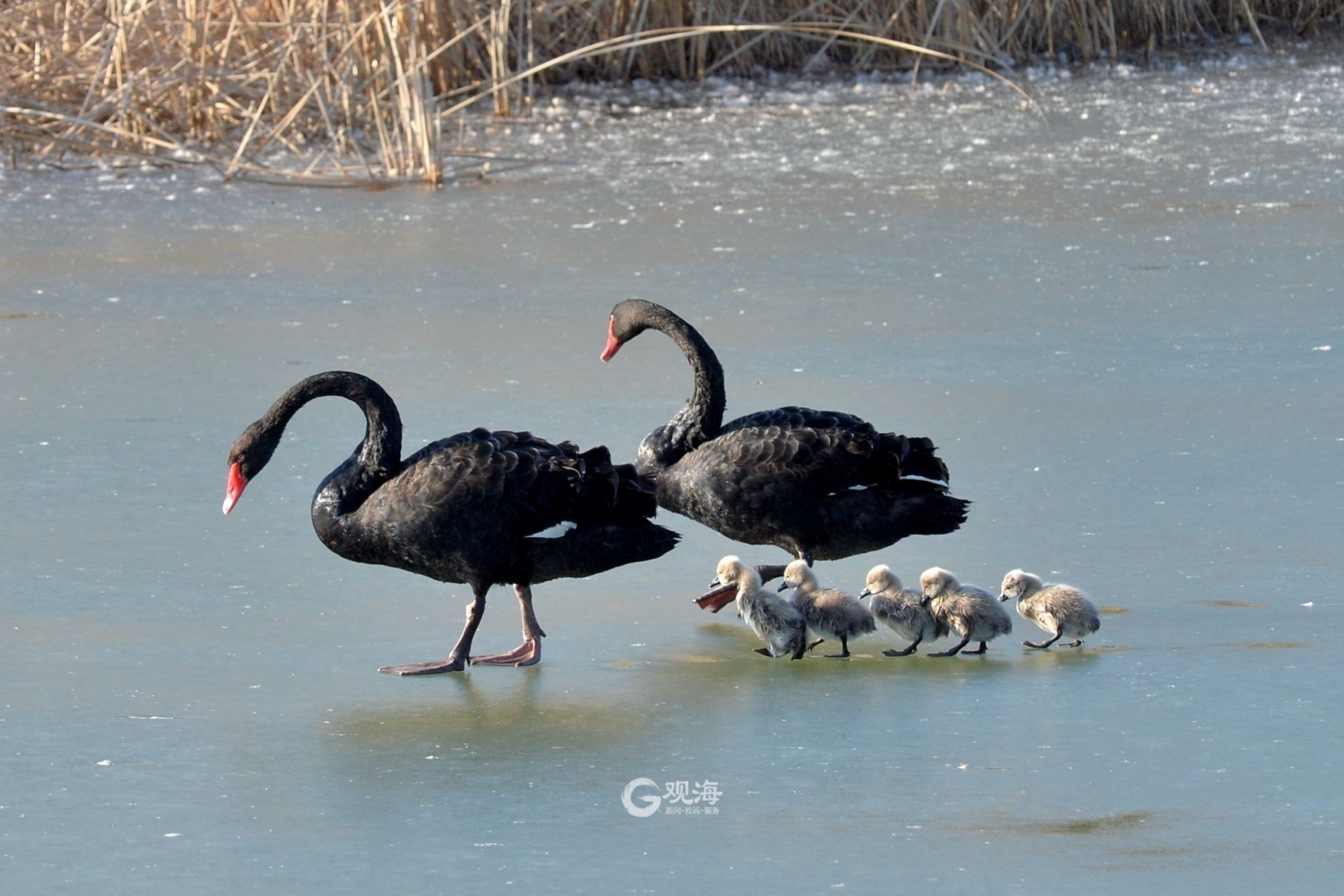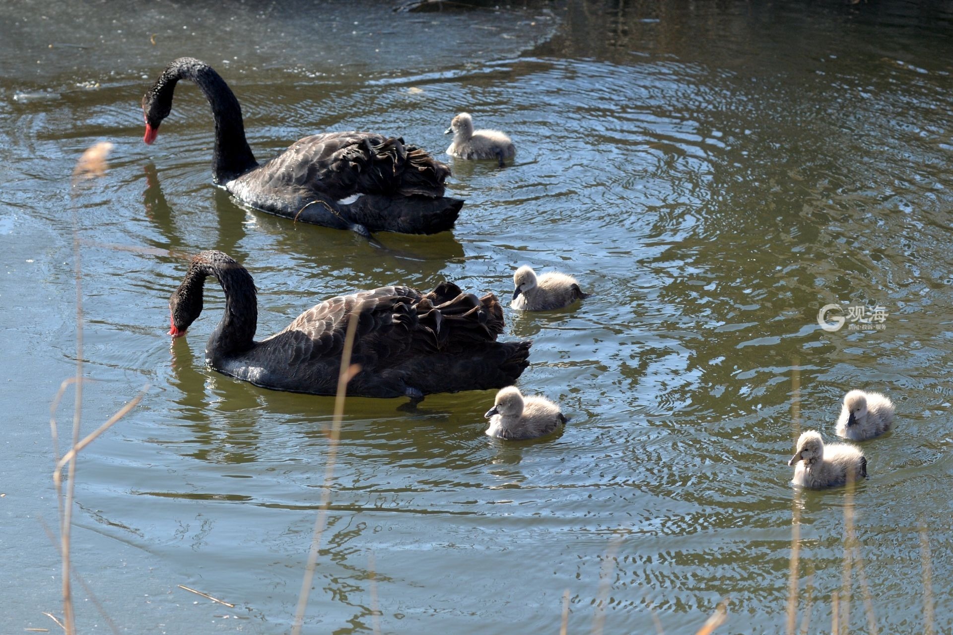 - 记者在现场看到,黑天鹅夫妇对小天鹅呵护备至,毛茸茸的小家伙则亦步亦趋紧跟父母,模样乖巧惹人喜爱。除了黑天鹅一家外,这里还住着一对白天鹅夫妇以及成群的野鸭、白骨顶鸡等水鸟,十分热闹。