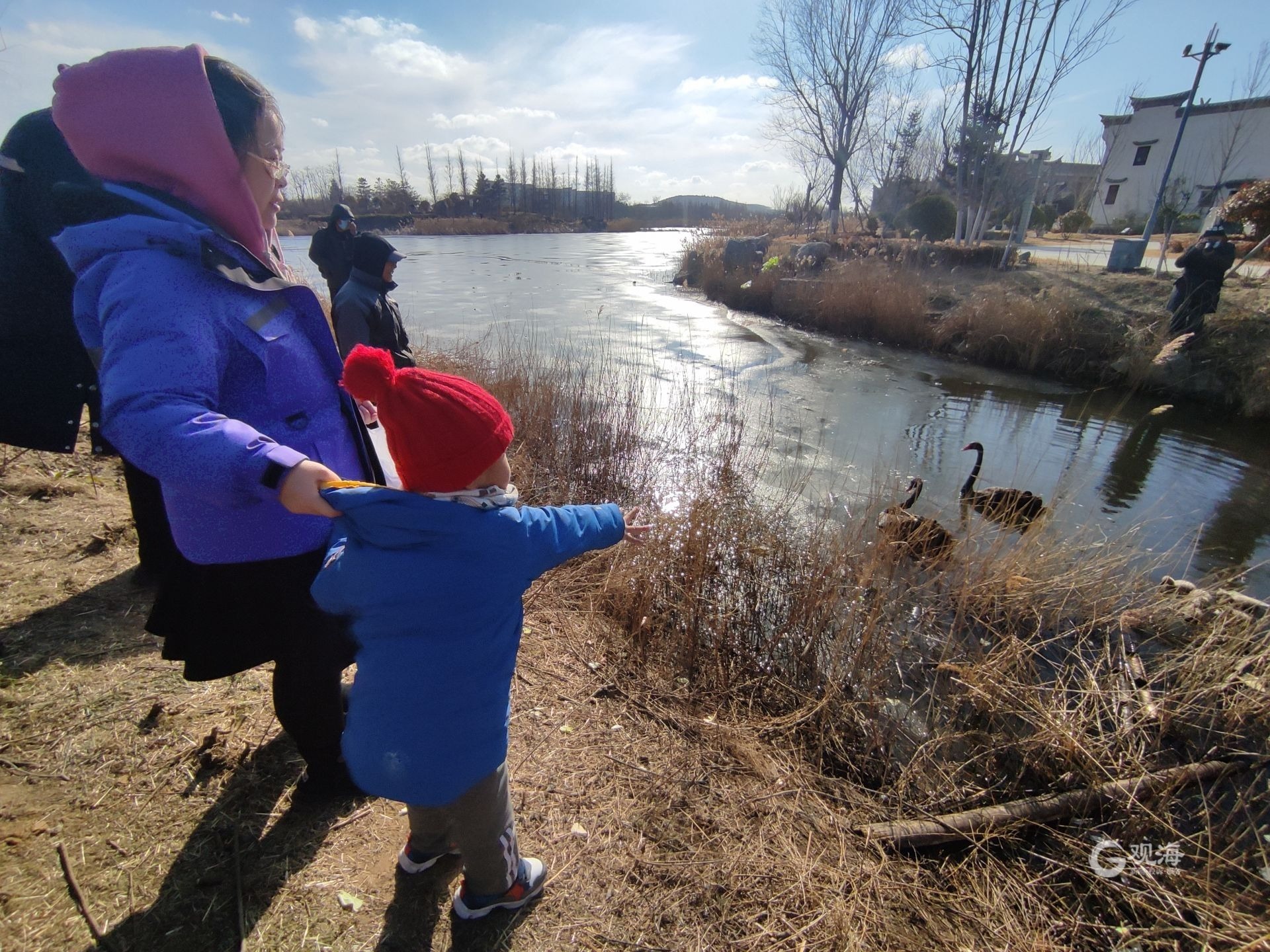 - 市民在岸边欣赏黑天鹅。