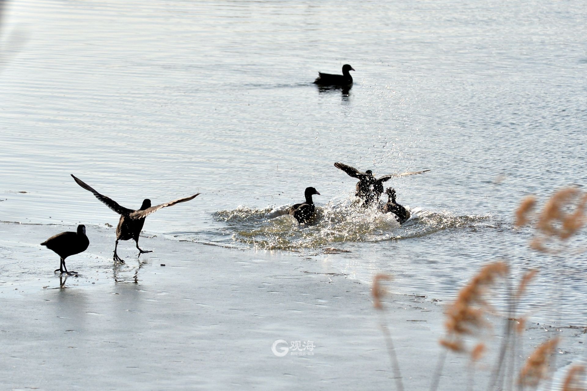 - 白骨顶鸡在水上嬉戏。