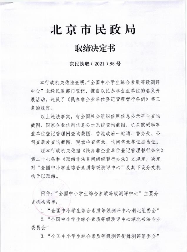 2021年10月,北京市民政局经过调查,认定“全国中小学生综合素质等级测评中心”未经登记,擅自以民办非企业单位名义进行活动,违反了《民办非企业单位登记管理暂行条例》规定。依据《民办非企业单位登记管理暂行条例》和《取缔非法民间组织暂行办法》规定,北京市民政局对其及下设分支机构依法作出取缔决定。2021年11月,执法人员到该“中心”办公地点进行现场取缔,并在北京市民政局官方网站进行了公告。