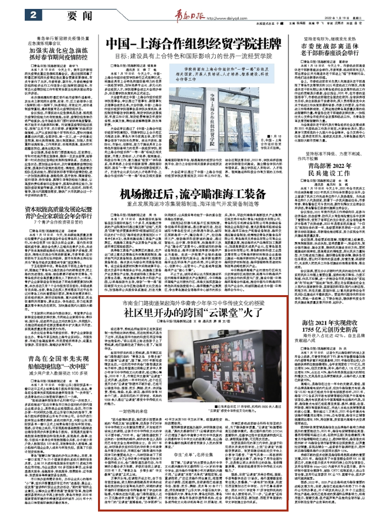 赵丽华所说的网上剪纸课,是市南区在金门路街道打造的“青春之岛 乡情乡韵”华文教育“云课堂”。据了解,2020年新冠疫情发生后,一位印尼华侨向金门路街道发来电子邮件,提出希望通过网络让更多华人青少年学习中华传统文化的请求。经过精心筹备,2020年7月,市南区华文教育“云课堂”正式开课。此后的一年半时间内,这个社区里开办的“云课堂”软硬件不断升级,已经可以涵盖书法、国画、民乐、舞蹈、武术、诗词鉴赏、剪纸、蜡染、扎染、绢花、海洋科学等30余个门类,来自印尼的37所学校、机构的5000余人通过“云课堂”感受中华传统文化的魅力。