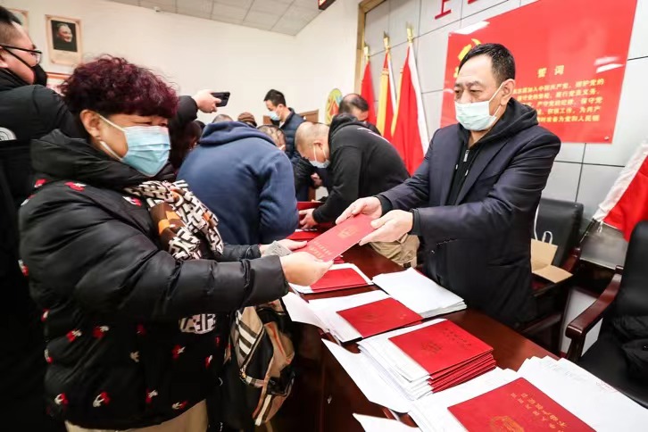 - 2015年以来,李沧区虎山路街道上王埠社区的居民们陆续回迁,但“有房无证”的问题却一直困扰着小区居民。今年,经过李沧区虎山路街道、不动产登记部门、税务部门通力协作,居民们的不动产权证陆续办下来了。1月24日上午,记者来到上王埠社区,用镜头记录下居民们排队领证的画面。青岛日报社/观海新闻记者 柳栋 摄 | 责任编辑 宋新华