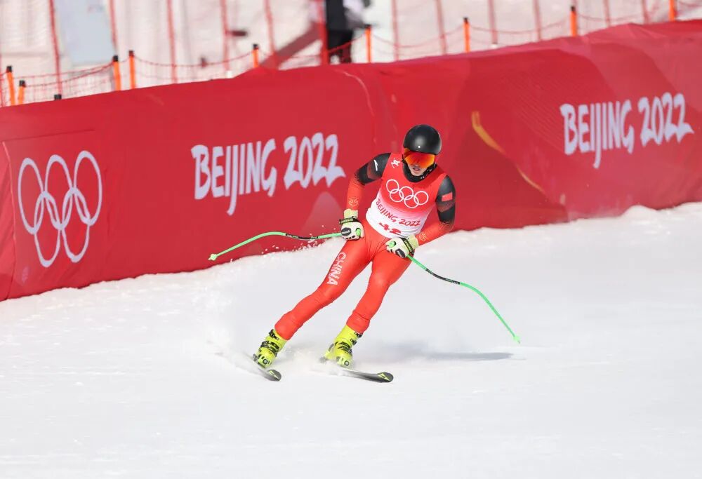 2月7日,北京2022年冬奥会高山滑雪男子滑降项目比赛在延庆国家高山滑雪中心举行。图为中国选手徐铭甫在比赛中。新华社记者 陈斌摄