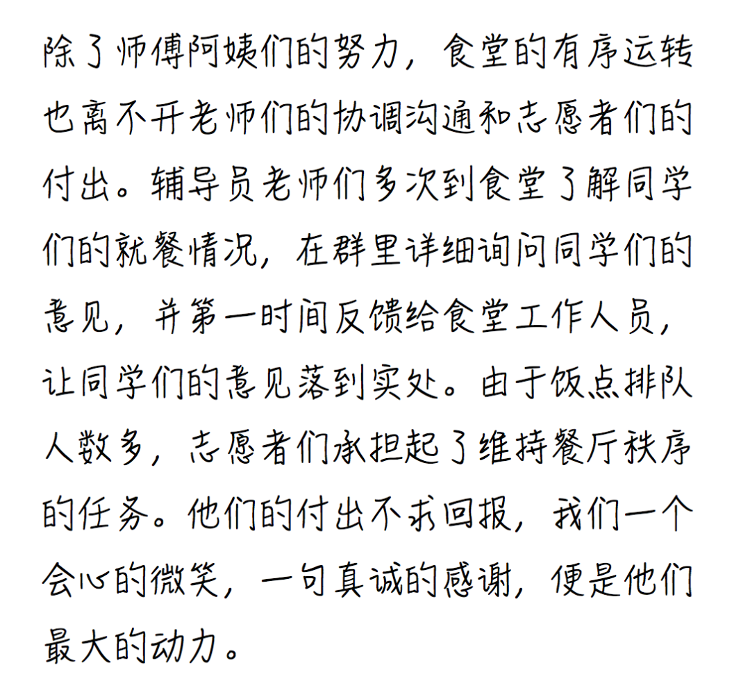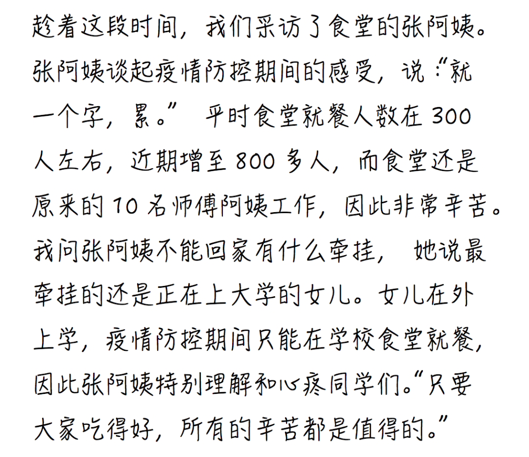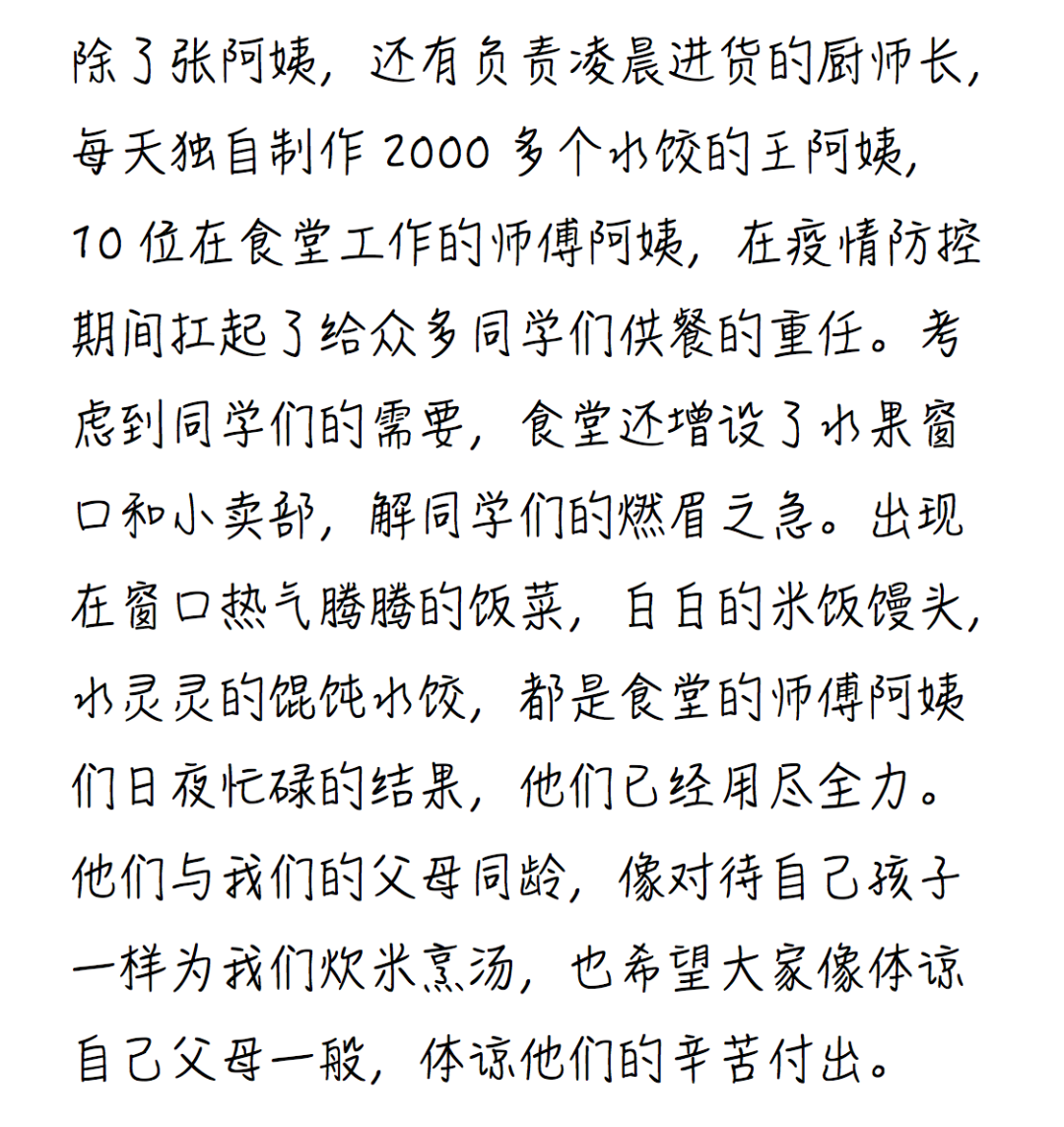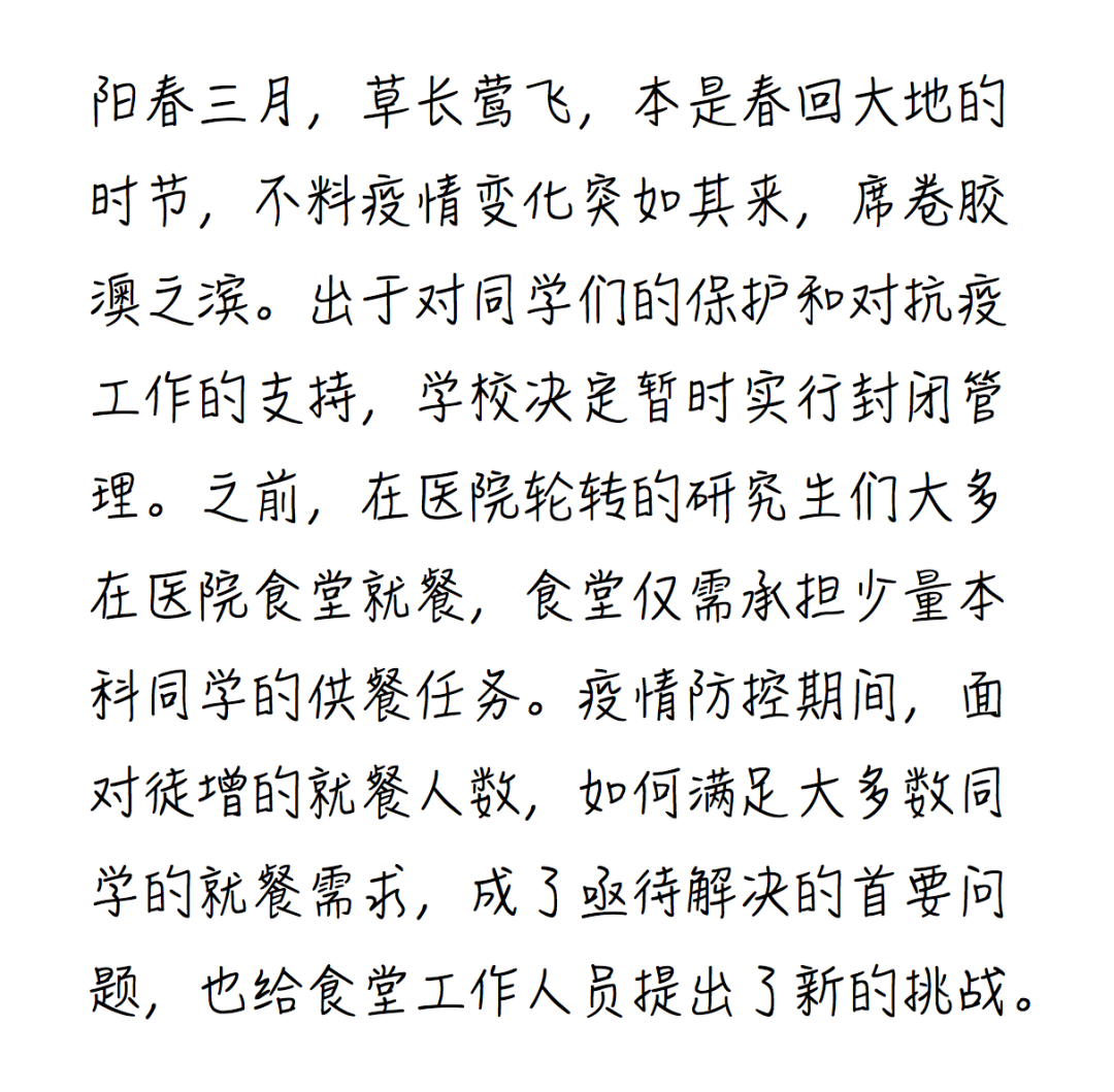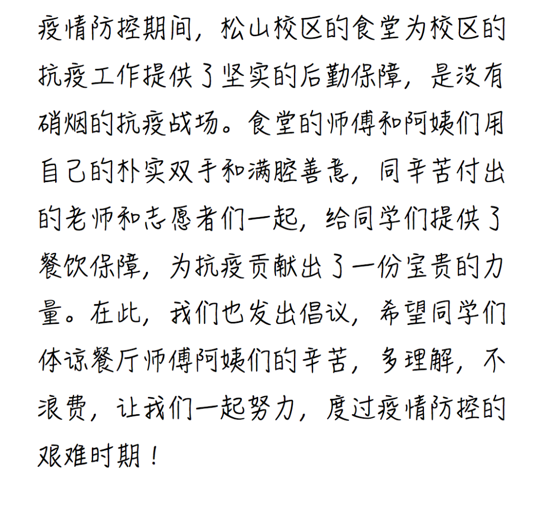 近日,我们收到了一封特别的来信 这封信来自两名松山校区新媒体志愿者。 抗疫战疫,粮草先行。 看看在她们的眼中,后勤餐饮人的一天! 刘耿君,医学部2020级 周书雅,医学部2018级 (文/刘耿君 图/周书雅 通讯员/孙竹媛) 责任编辑:杨海涛 0