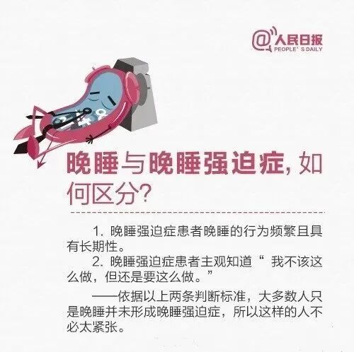 晚睡与晚睡强迫症鉴别:心理学定义的强迫症必须有两个元素,一个是发作的密度和长期性,第二个是本人知道“我不该这么做,但还是要这么做。”之所以这样定义,是因为其实很多人只是晚睡,根本谈不上晚睡强迫症。所以这样的人不必太紧张。但晚睡族要注意自我检查,不要慢慢演变成晚睡强迫症才开始治疗。