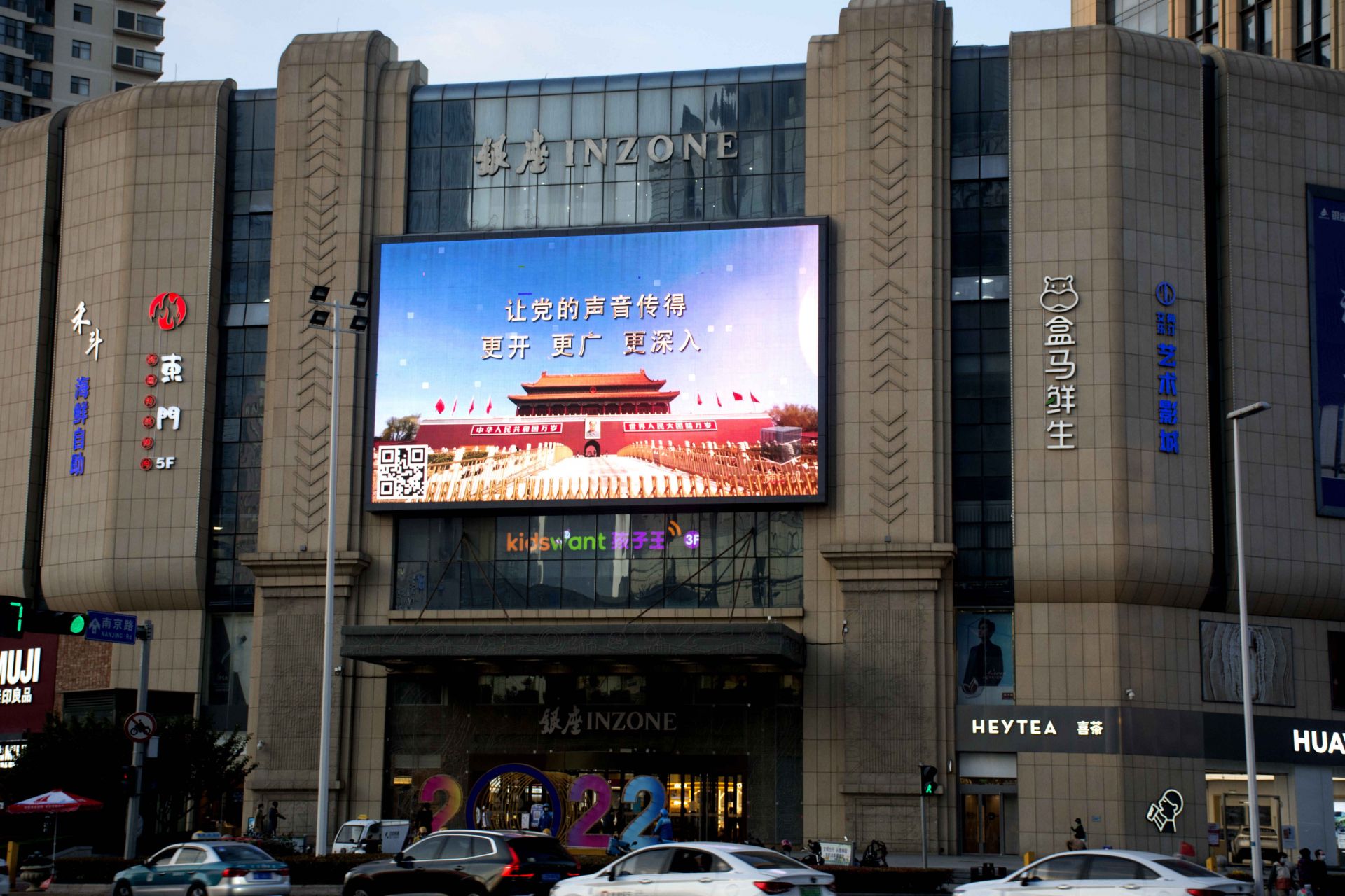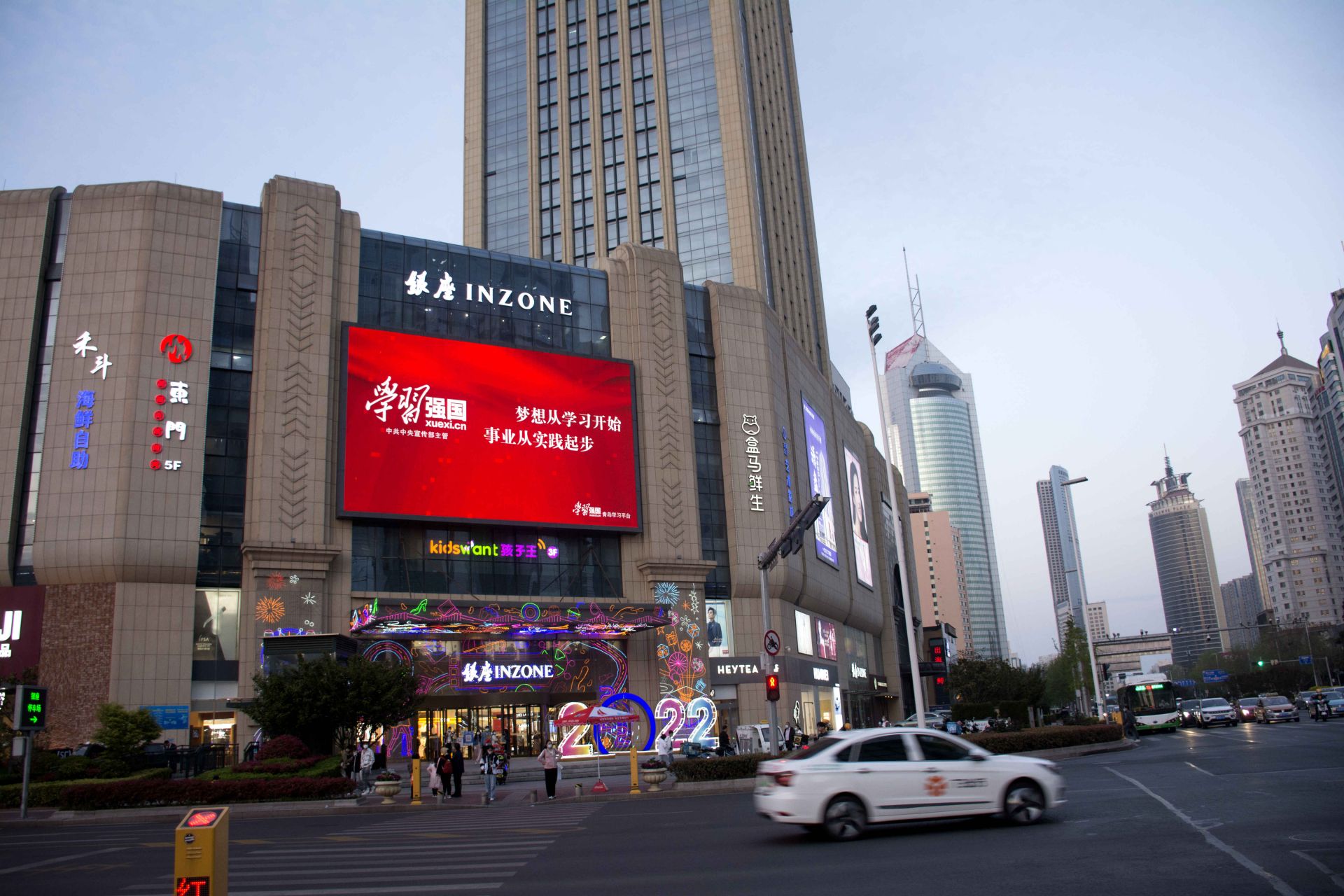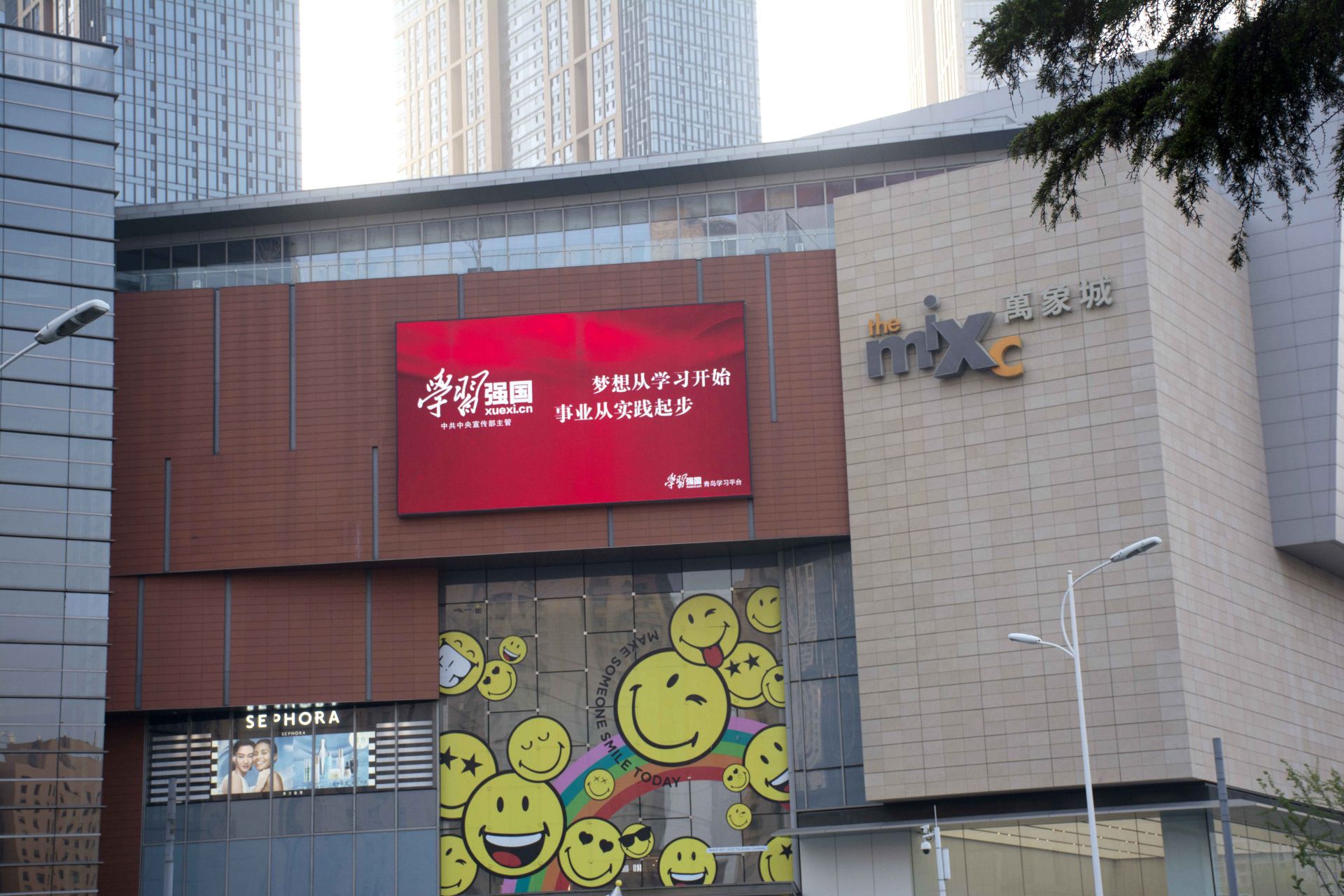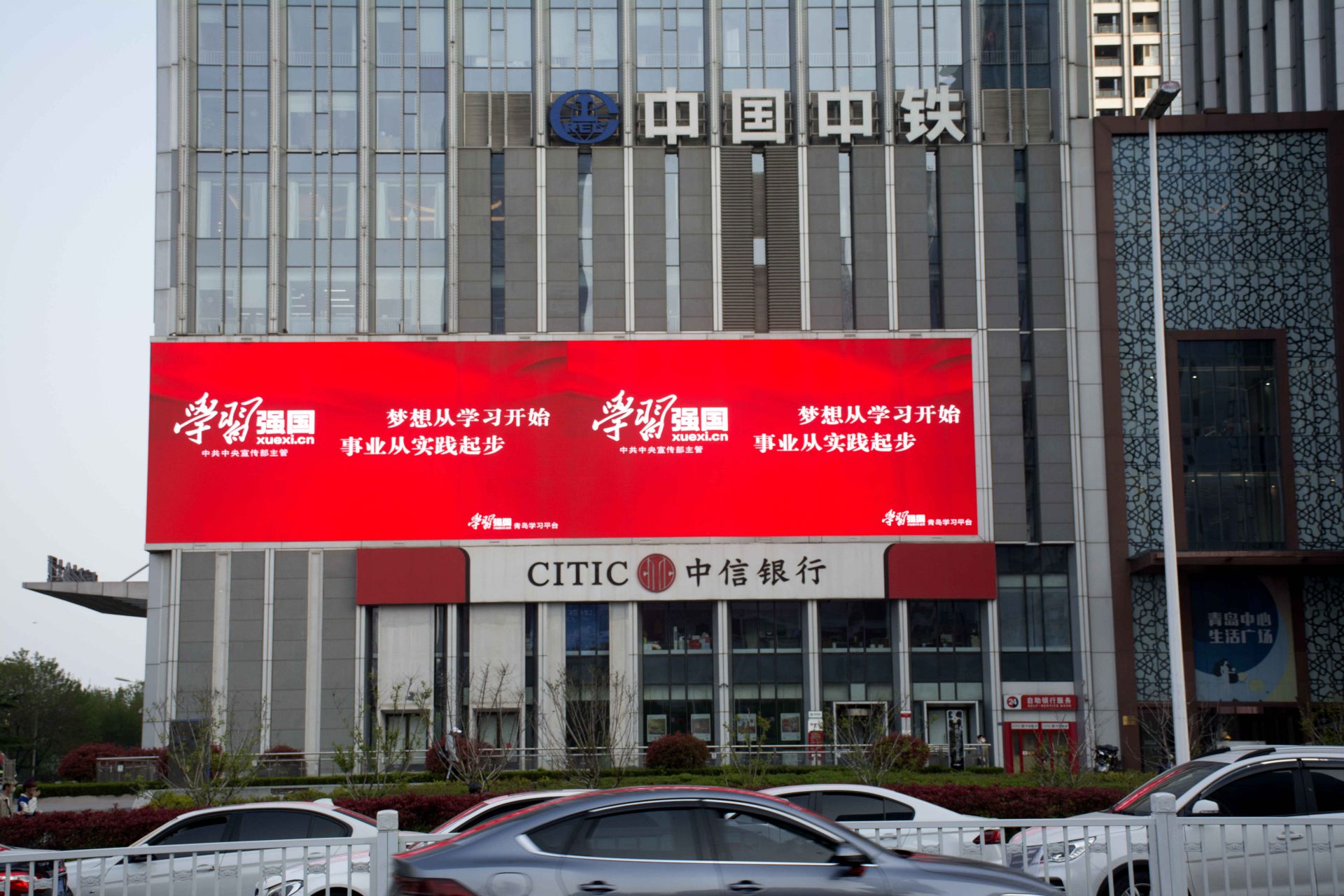 中铁青岛中心门口的户外电子大屏上滚动播放“学习强国”学习平台主题公益广告,到了夜间还会与大楼的灯光秀交相辉映。