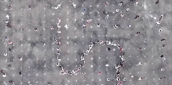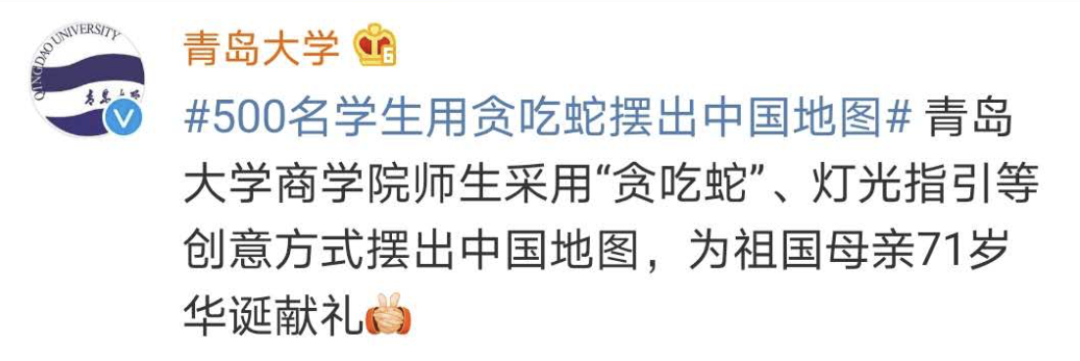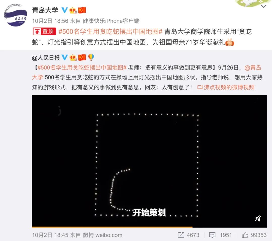 近日,青岛大学商学院500名学生,用贪吃蛇的形式,在操场上用人体灯光摆出了中国地图的形状。