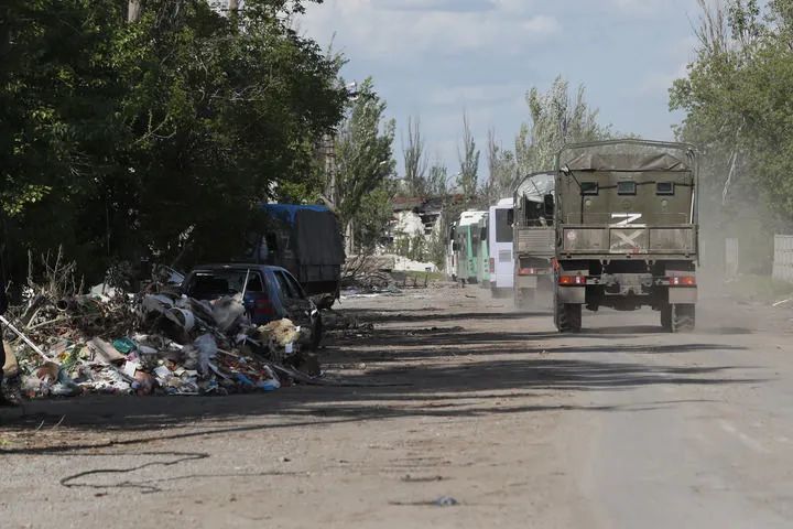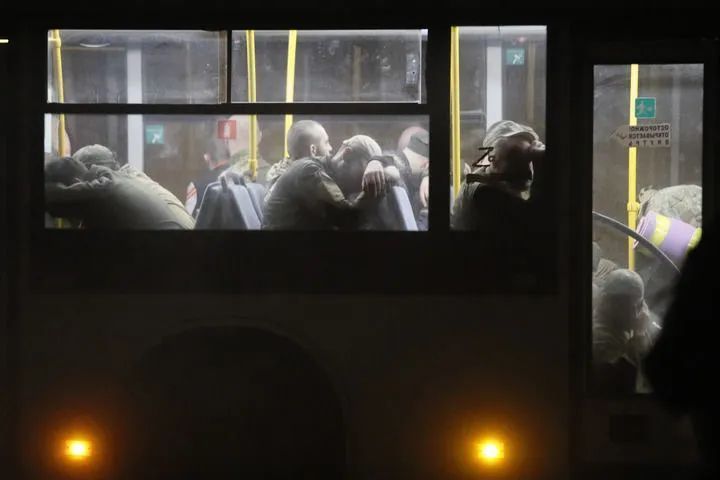 5月20日,载着乌克兰武装人员的巴士抵达俄军控制的奥列尼夫卡镇。(新华社发,维克托摄)