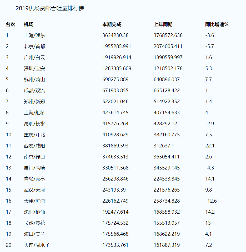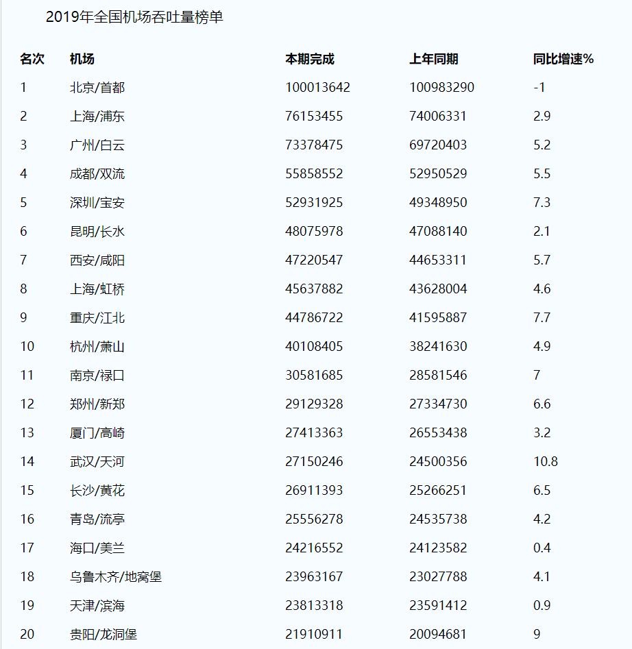放眼全国,青岛流亭机场居于什么水平?从客货吞吐量来看,2019年,上海浦东机场的旅客吞吐量和货邮分别达到7615.3万人次和363.4万吨,客货吞吐量分别排名全国第2位和第1位。深圳机场旅客吞吐量5293.2万人次,货邮吞吐量128.3万吨,分别排名全国第5位和第4位。青岛流亭机场旅客吞吐量2555.6万人次、货邮吞吐量25.6万吨,分别居全国第16位和14位,差距还是很明显的。